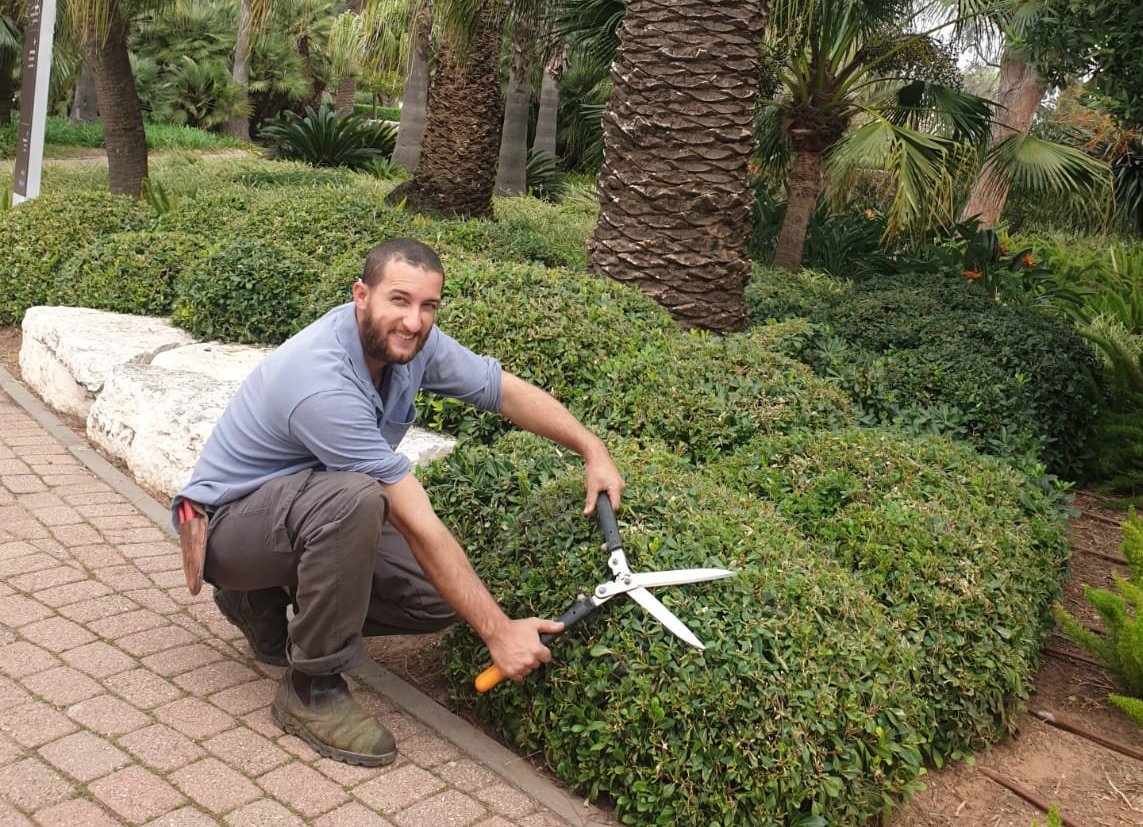 A day in Stav’s life includes waking up very early (5:00 am) and breakfast with little Kai and with Yu, his beloved wife whom he met when they worked together on a cruise ship. By 6:30 am Stav is already surrounded by his workmates, the gardening, maintenance and forestry staff, having a morning coffee before beginning the day’s tasks. From now until the late afternoon he’ll be pruning, planting (not during the Shmita year), cleaning, and a partner in “healing nature”.